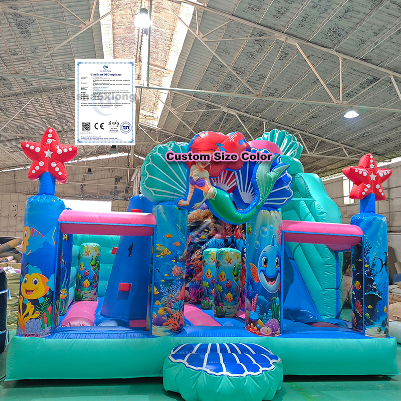 A mermaid cartoon theme inflatable bounce house with slide is a multi-functional inflatable structure that integrates: